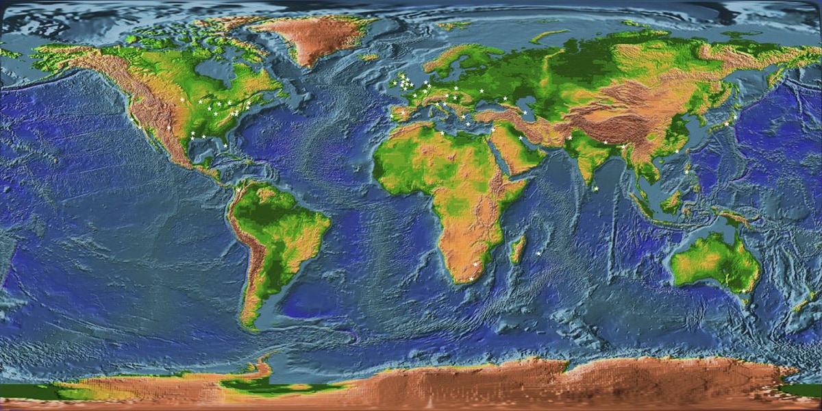 World map courtesy NASA (stars added)